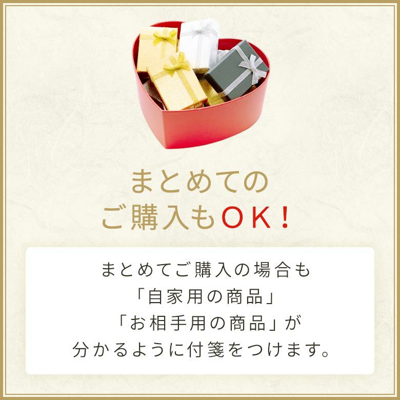 ※複数商品を注文した際に、個別熨斗掛けと数点まとめて熨斗掛けの指定をする場合は、『備考欄』に熨斗掛けのご指示内容をご入力ください。