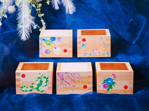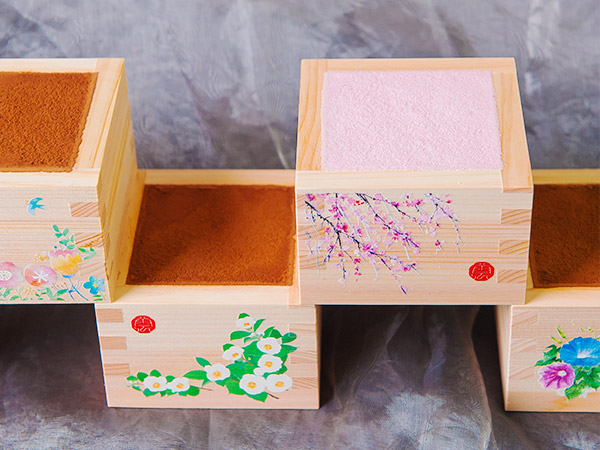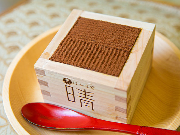 色彩豊かな挿絵を施した岐阜県大垣市の本ヒノキ枡の中には北海道産マスカルポーネチーズの風味豊かな濃厚ティラミス。