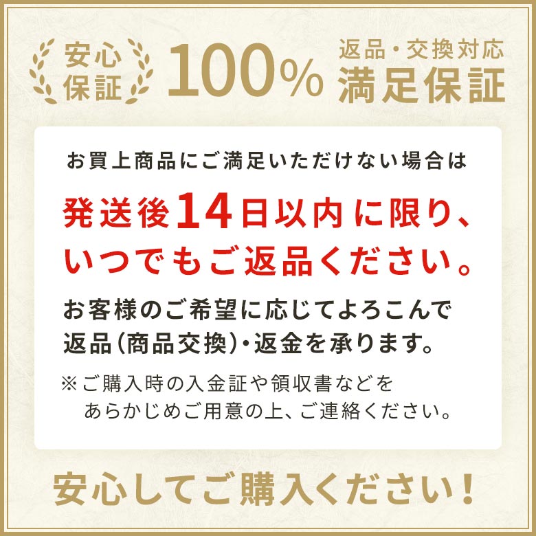 お買上商品にご満足いただけない場合は、ご購入後14日以内に限り、返金致しますのでご返品ください。例え開封していてもご返品が可能です。