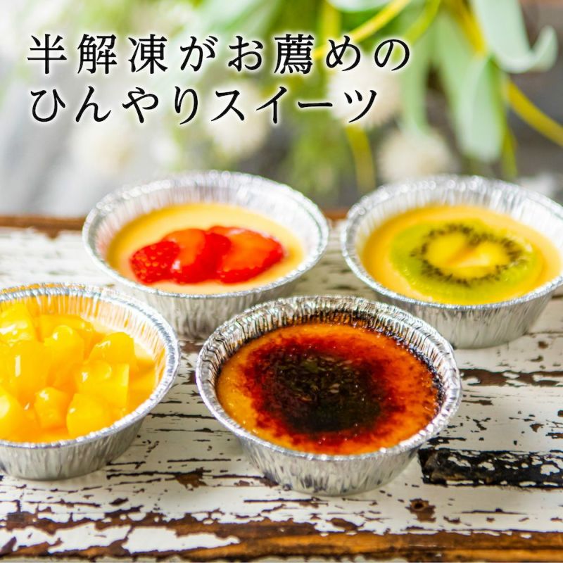 キャラメル・苺・キウイ・パイン&マンゴーの4種セット。冷凍状態では滑らかなアイス風、半解凍でスッと解ける口当たり、冷蔵解凍では濃厚なプリン風に味わいの変化を楽しめます。