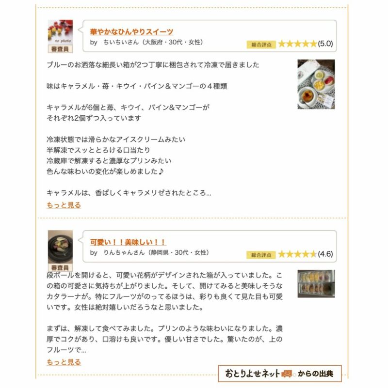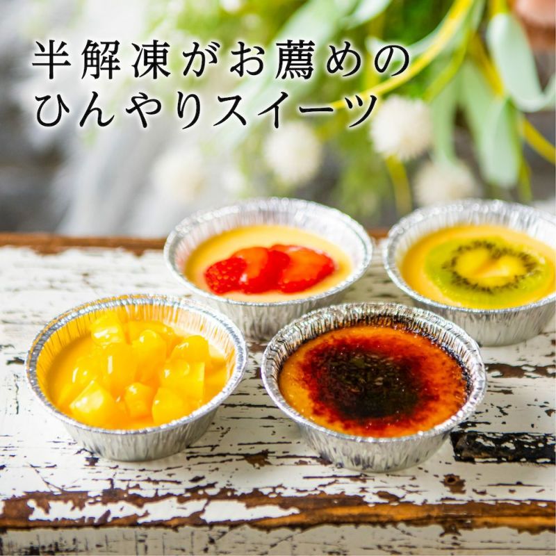 キャラメル・苺・キウイ・パイン&マンゴーの4種セット。冷凍状態では滑らかなアイス風、半解凍でスッと解ける口当たり、冷蔵解凍では濃厚なプリン風に味わいの変化を楽しめます。
