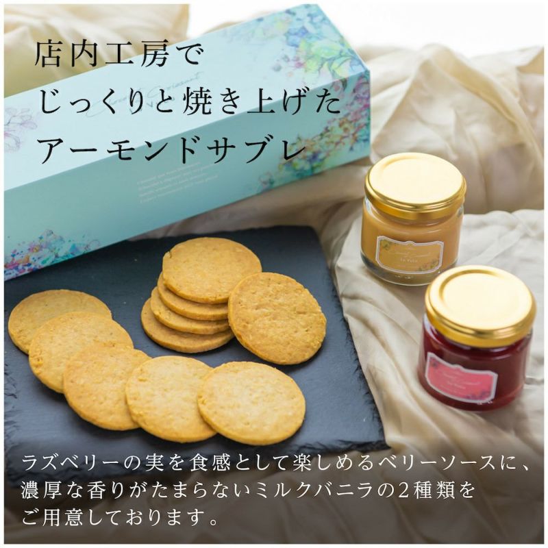 焙煎した薄力粉を使用し、じっくりと店内工房で焼き上げたアーモンドサブレに、自家製のクリームをディップして楽しむ体験型スイーツ。ラズベリーの実を食感として楽しめるベリーソースに、濃厚な香りがたまらないミルクバニラの2種類をご用意しております。