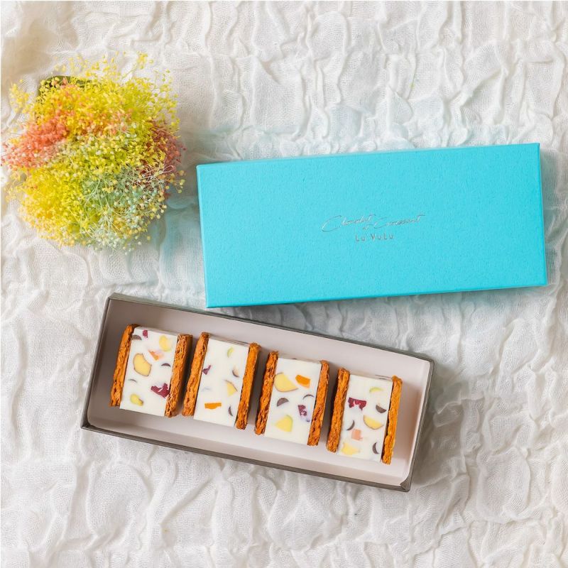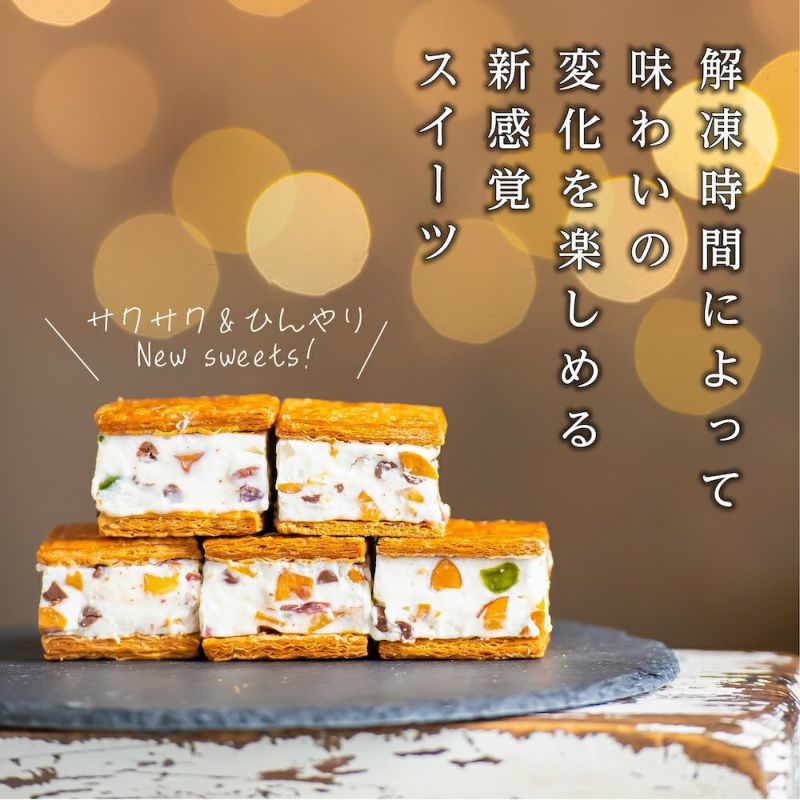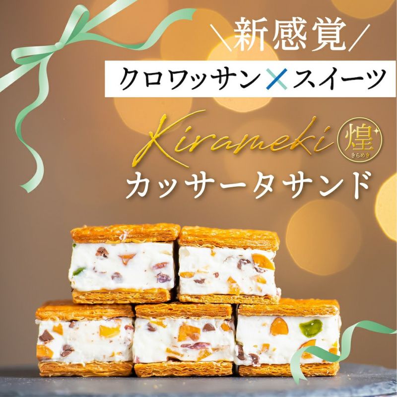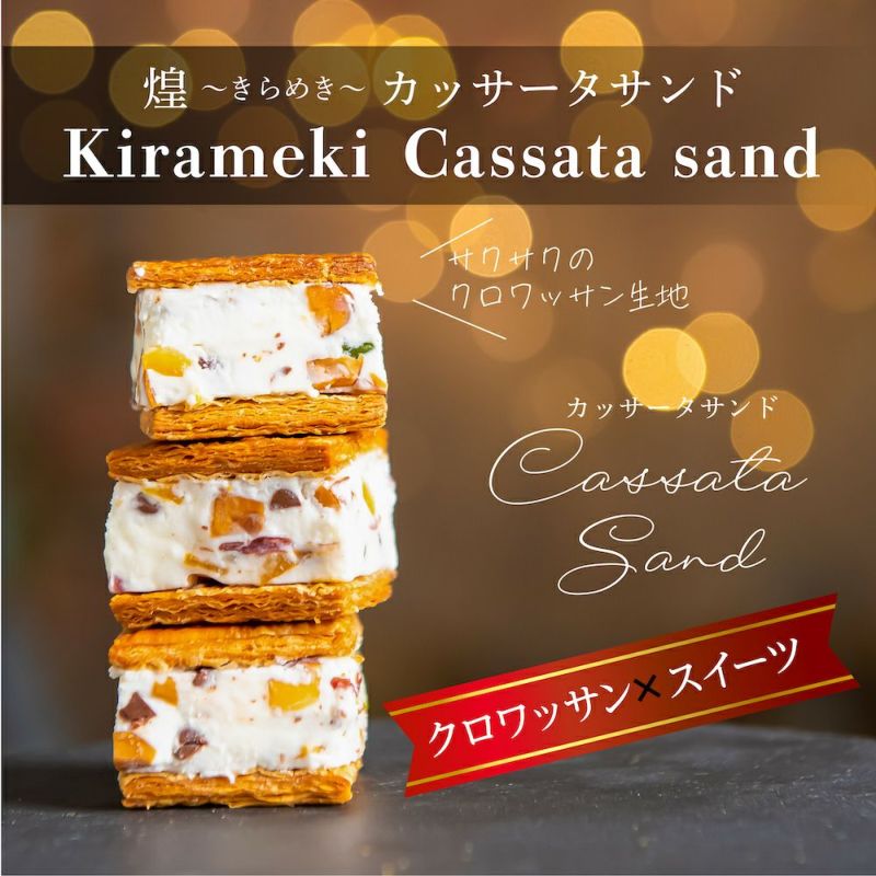 フランス産発酵バターを使用したクロワッサン生地で、カッサータをサンド。ドライフルーツとナッツを贅沢にミックスしたシチリア伝統的なアイスチーズケーキのカッサータ。解凍時間によって味わいの変化を楽しめる新感覚スイーツです。