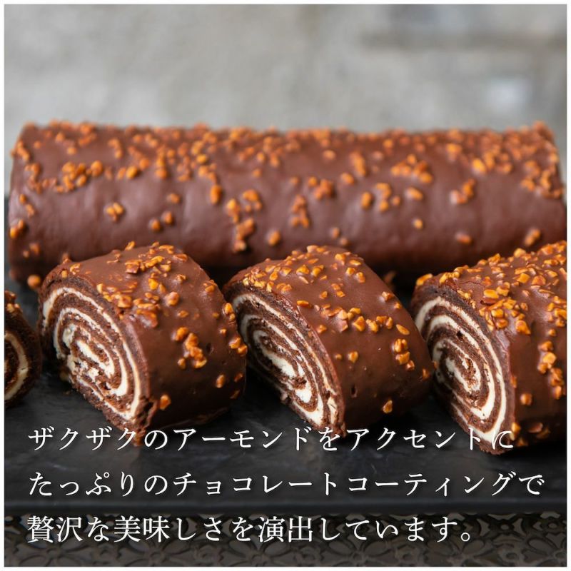 ふわっふわなココア香るシフォン生地とバニラ風味の生チョコが層になった、チョコレート専門店ならではのロールケーキ。ザクザクのアーモンドをアクセントに、たっぷりのチョコレートコーティングで、贅沢な美味しさを演出しています。