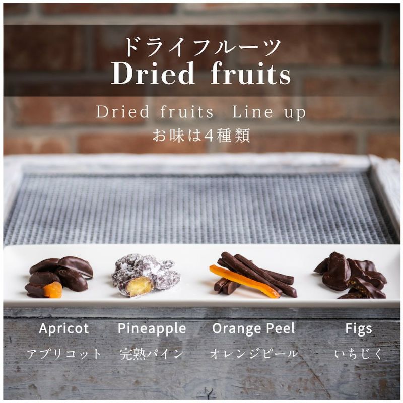 ドライフルーツをビターなチョコレートで一つ一つコーティングしました。ドライフルーツの凝縮したフルーツの酸味や甘み、フルーツに合わせたビターチョコレートとの絶妙なハーモニーをお楽しみください。
