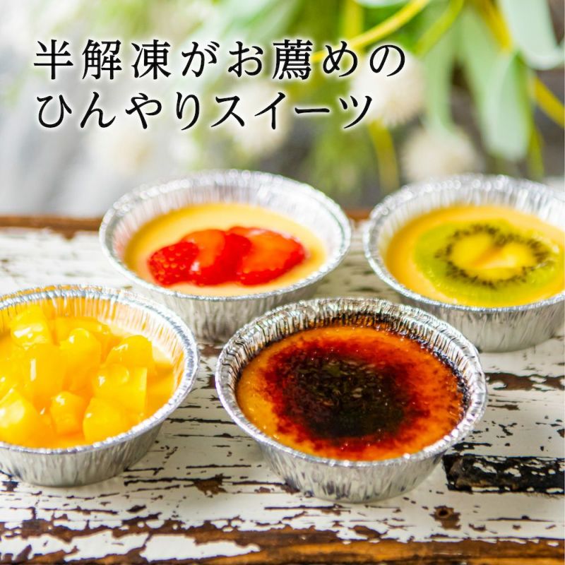 キャラメル・苺・キウイ・パイン&マンゴーの4種セット。冷凍状態では滑らかなアイス風、半解凍でスッと解ける口当たり、冷蔵解凍では濃厚なプリン風に味わいの変化を楽しめます。