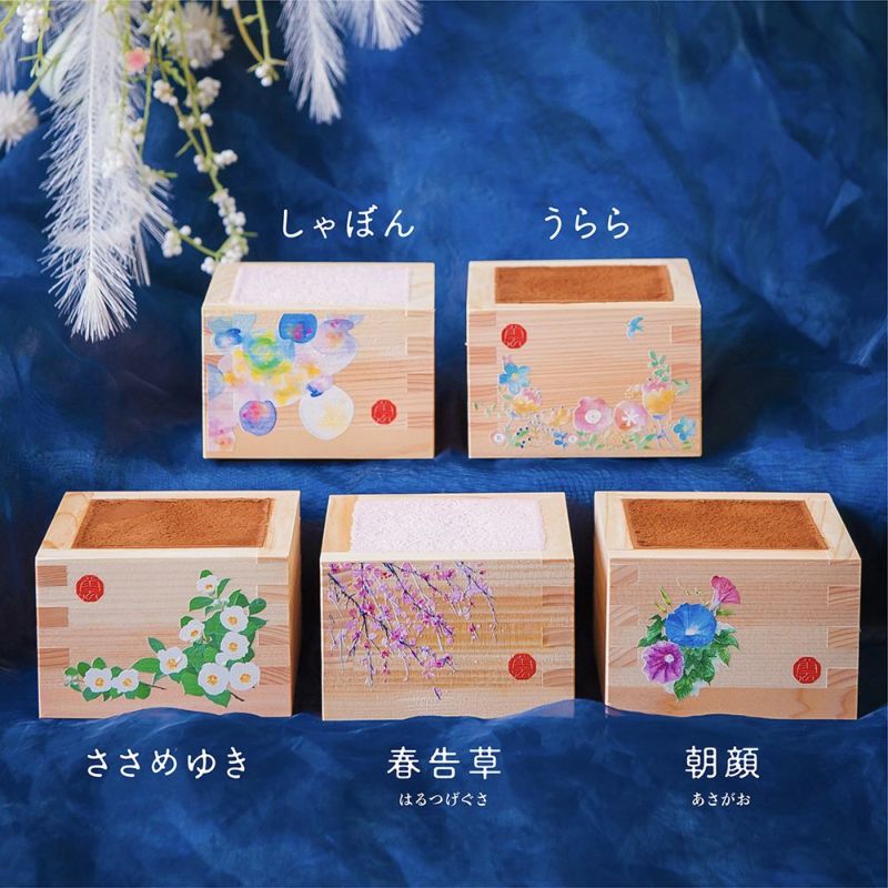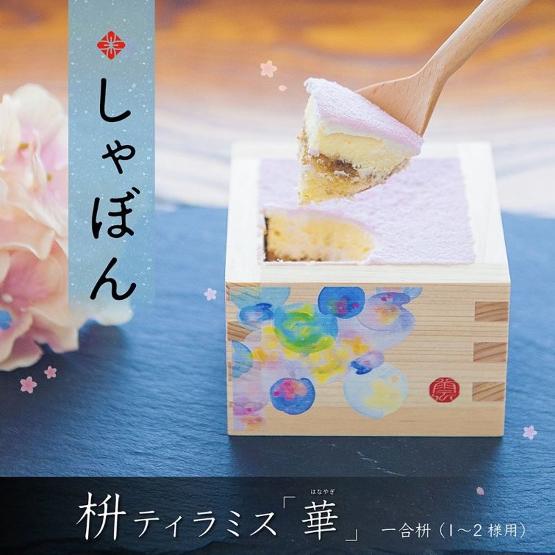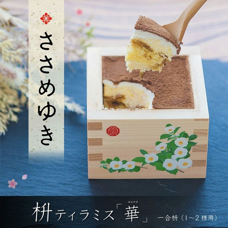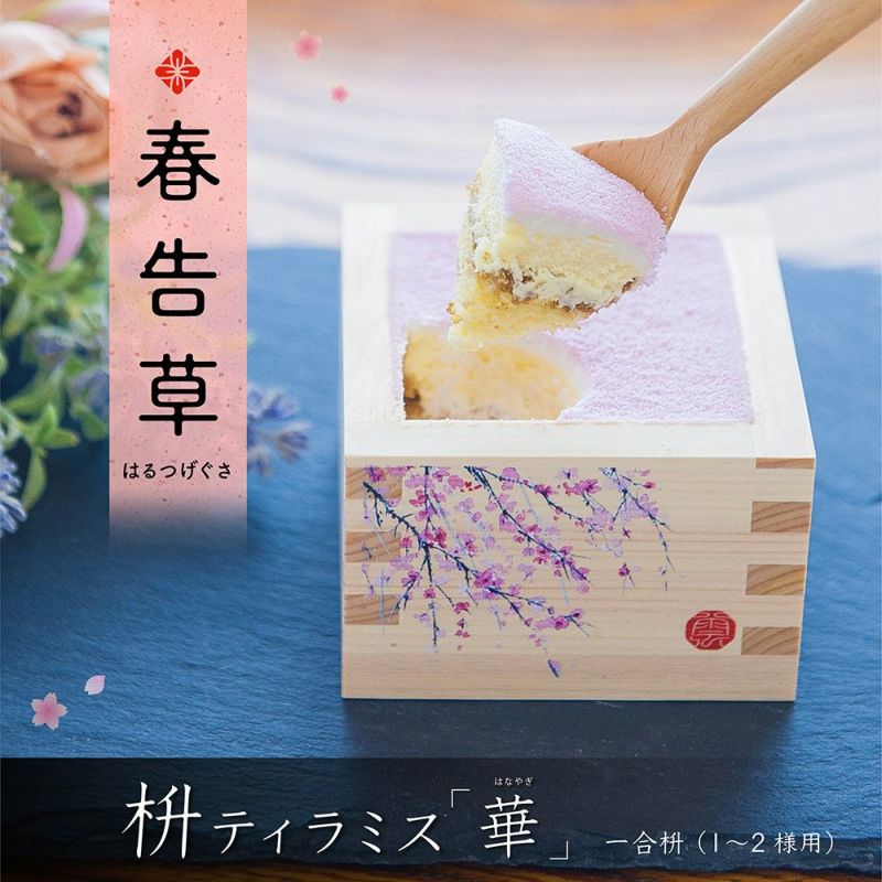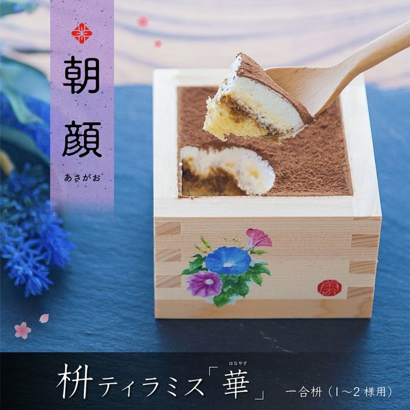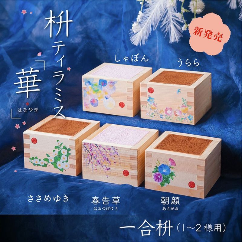 色彩豊かな挿絵を施した岐阜県大垣市の本ヒノキ枡の中には北海道産マスカルポーネチーズの風味豊かな濃厚ティラミス。