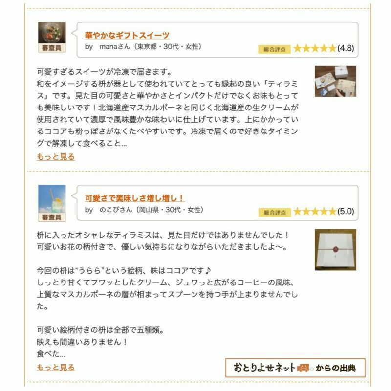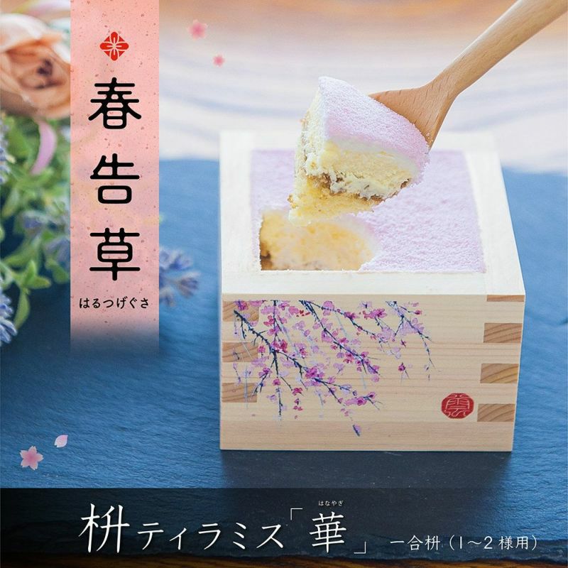 色彩豊かな挿絵を施した岐阜県大垣市の本ヒノキ枡の中には北海道産マスカルポーネチーズの風味豊かな濃厚ティラミス。